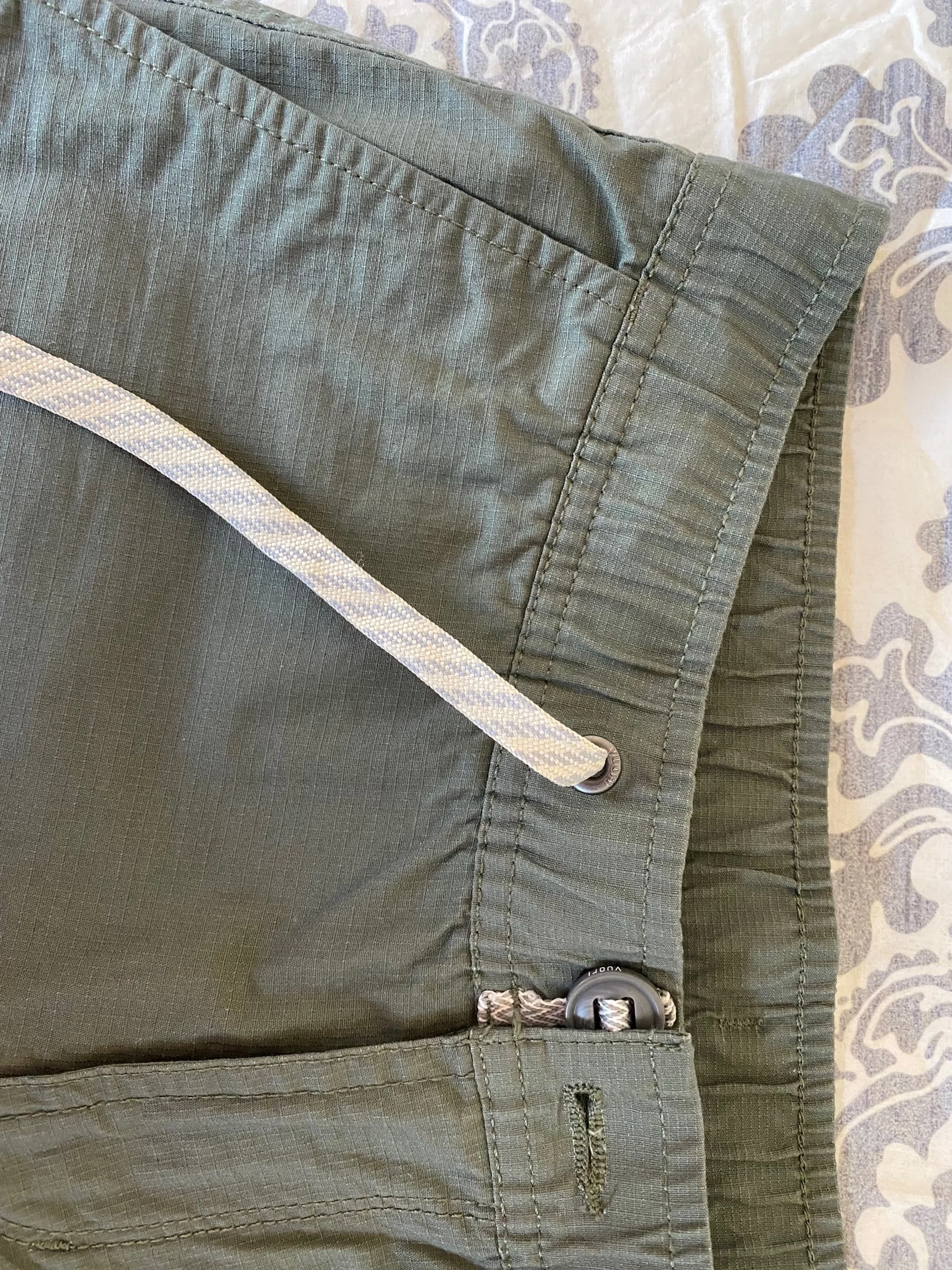 I love the Vuori joggers and have more than one pair in my closet. I ordered the Ripstop pants in the same size as my joggers, which turned out to be a fair comparison in sizes. What I found when I tried on these new pants, is that the overall fit was as expected but the waist seemed snug. There is an elastic waist component to the Ripstop pants, but they also have a zipper and button closure. For some reason the waist fit just wasn’t right. Even when I looked at it in the mirror it looked “wrong”. I unbuttoned the pants and then re-buttoned them a couple of times, only to realize that the button was the issue.